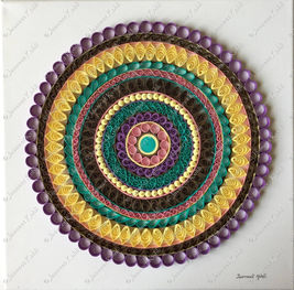 A stunning quilled mandala in shades of blue, grey, white, and navy unfolds in intricate symmetry on a durable foam board, creating a mesmerizing blend of depth and precision. The delicate paper filigree contrasts beautifully with the structured design, bringing balance and serenity to any space.