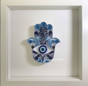 This quilled Hamsa design is a stunning representation of protection, harmony, and spiritual energy, beautifully crafted in shades of blue or a combination of colors. The intricate paper quilling forms elegant swirls and patterns, creating depth and texture that enhance the symbolic essence of the Hamsa hand.