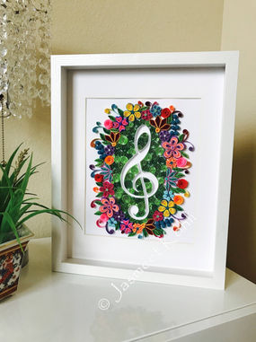 This quilled treble clef artwork beautifully blends music and artistry, featuring a white treble clef at the center, symbolizing harmony and rhythm. Surrounding it, elegant green scrolls flow gracefully, adding depth and movement to the design. Framing the composition is an oval border of vibrant flowers, meticulously crafted with intricate quilling techniques to create a dynamic and colorful display.